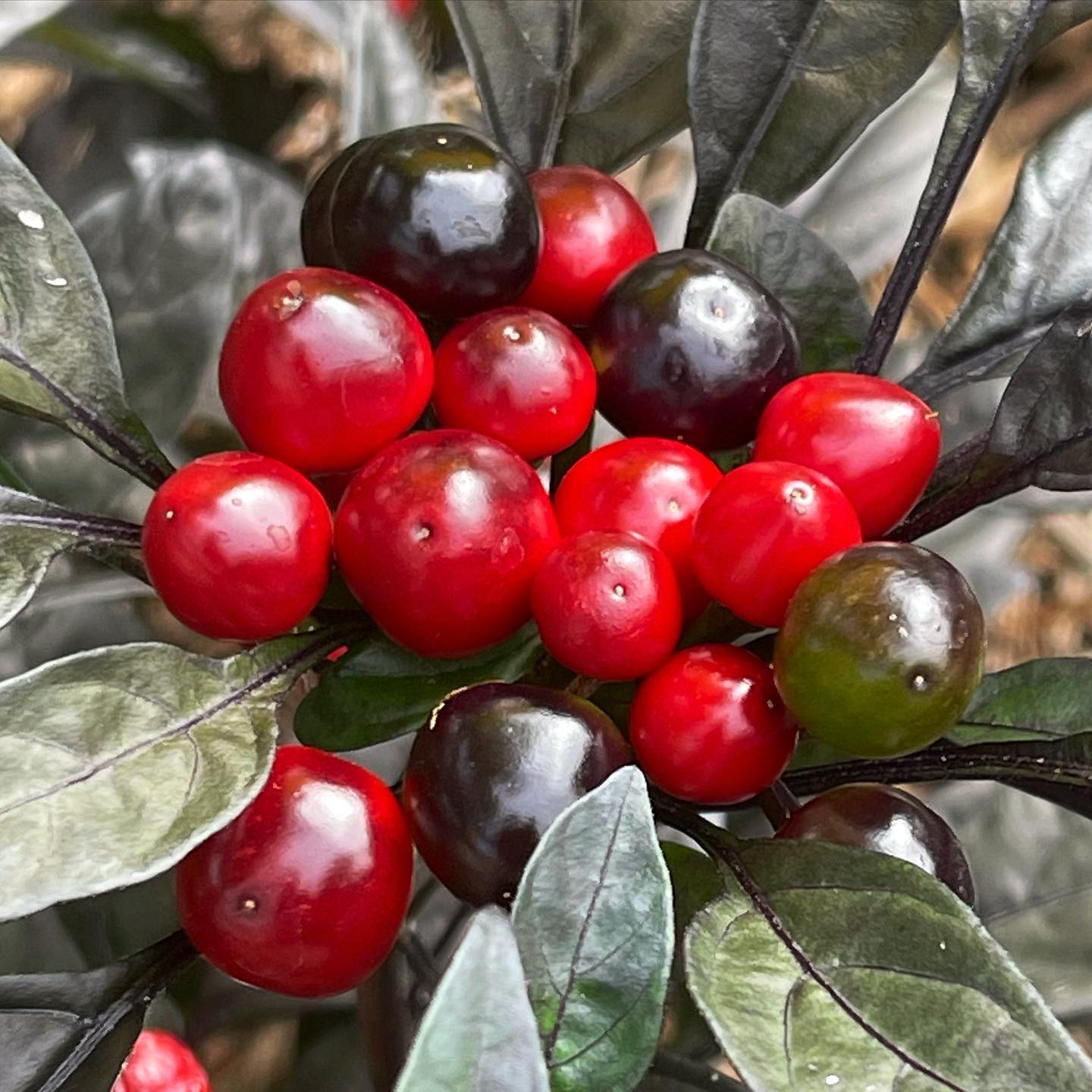 Striking dark foliage with clusters of glossy peppers