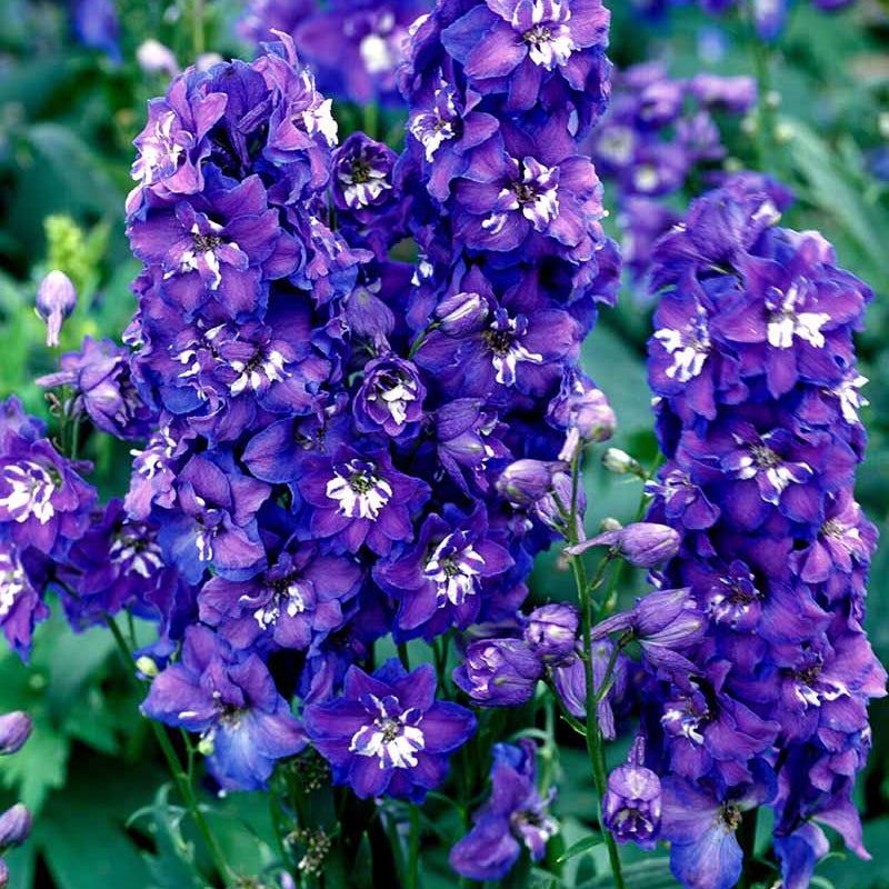 Ideal for cool climates, Delphiniums prefer full sunlight and nutrient-rich, well-drained soil. Their vertical growth habit makes them perfect as a backdrop for shorter plants, creating a dramatic layered effect in any garden landscape.