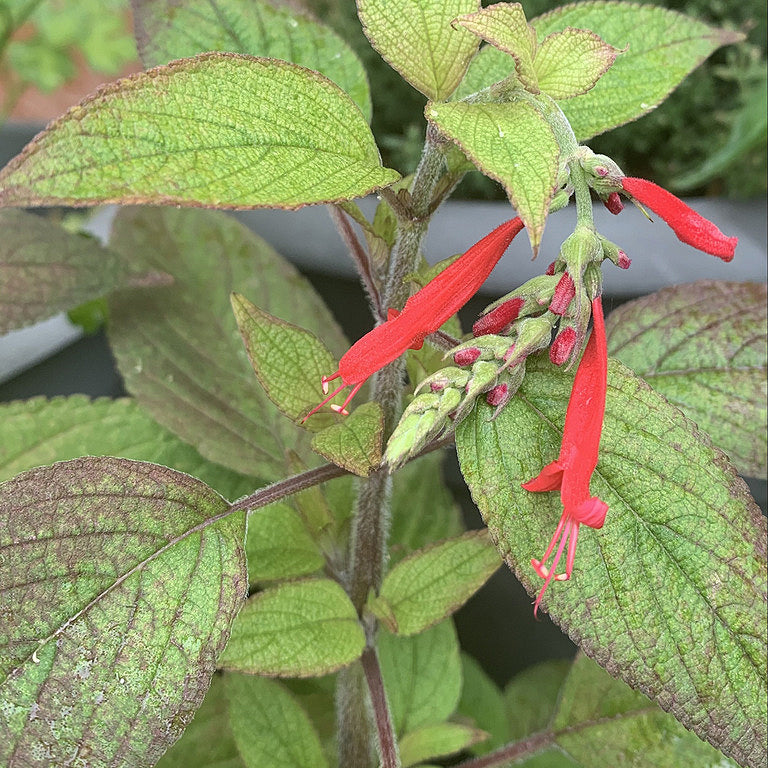 Pineapple Sage (Salvia elegans) is a delightful perennial herb known for its pineapple-scented leaves and vibrant red tubular flowers. It attracts hummingbirds, butterflies, and bees, making it a wonderful addition to pollinator gardens. The plant is easy to grow and performs well in warm, sunny areas, offering both ornamental beauty and aromatic foliage that can be used for culinary or decorative purposes.