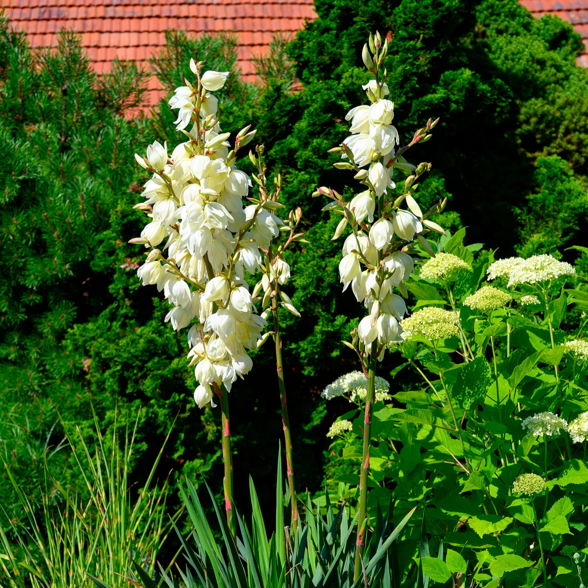Produces tall, dramatic flower spikes with creamy white blooms.